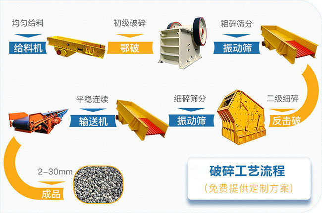 振動(dòng)給料機(jī)GZD1100×4200,1臺;顎式破碎機(jī)PE750×1060,1臺;歐版反擊破PFW1214Ⅲ,2臺;圓振動(dòng)篩4YZS2160,2臺。