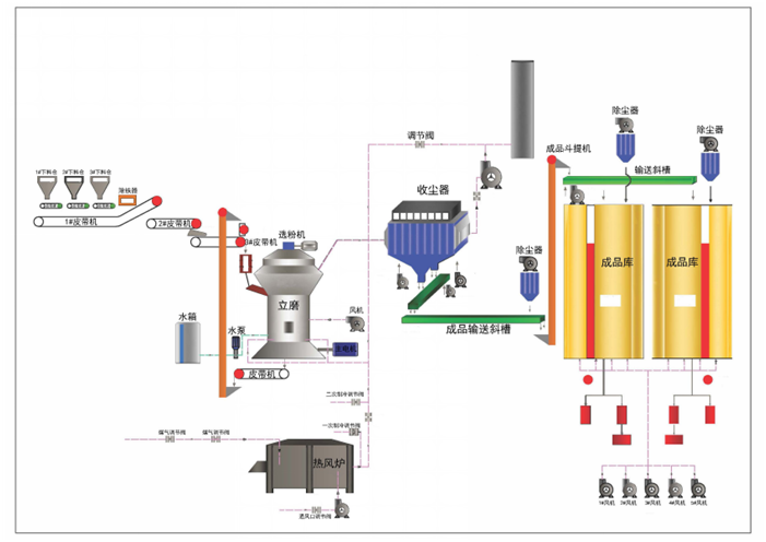 堆放著的礦渣由鏟車取料、喂料,通過皮帶機進行輸送。在輸送過程中,礦渣原料先后經(jīng)由除鐵器和振動篩得到除鐵和篩分,然后通過稱重設(shè)備倉、提升機進入礦渣立磨機進行粉磨。粉磨后的礦渣借助熱風爐提供的熱風,通過選粉機進行選粉,同時得到烘干。符合細度要求的礦渣粉較后被輸送到收塵器收集、盛放后,由空氣輸送斜槽、提升機進入成品庫中儲存。